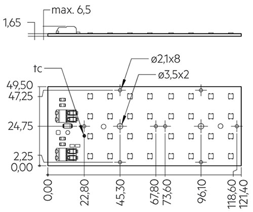 | Quadratisches LED Konstantstrommodul speziell für den Außenbereich | 350mA / 7,6W / 1450lm | 700mA / 15,9W / 2790lm | Lichtfarbe 3000°K | | CRI: 80 | Abmessungen: 49,5 x 121,4 x 6,5mm |