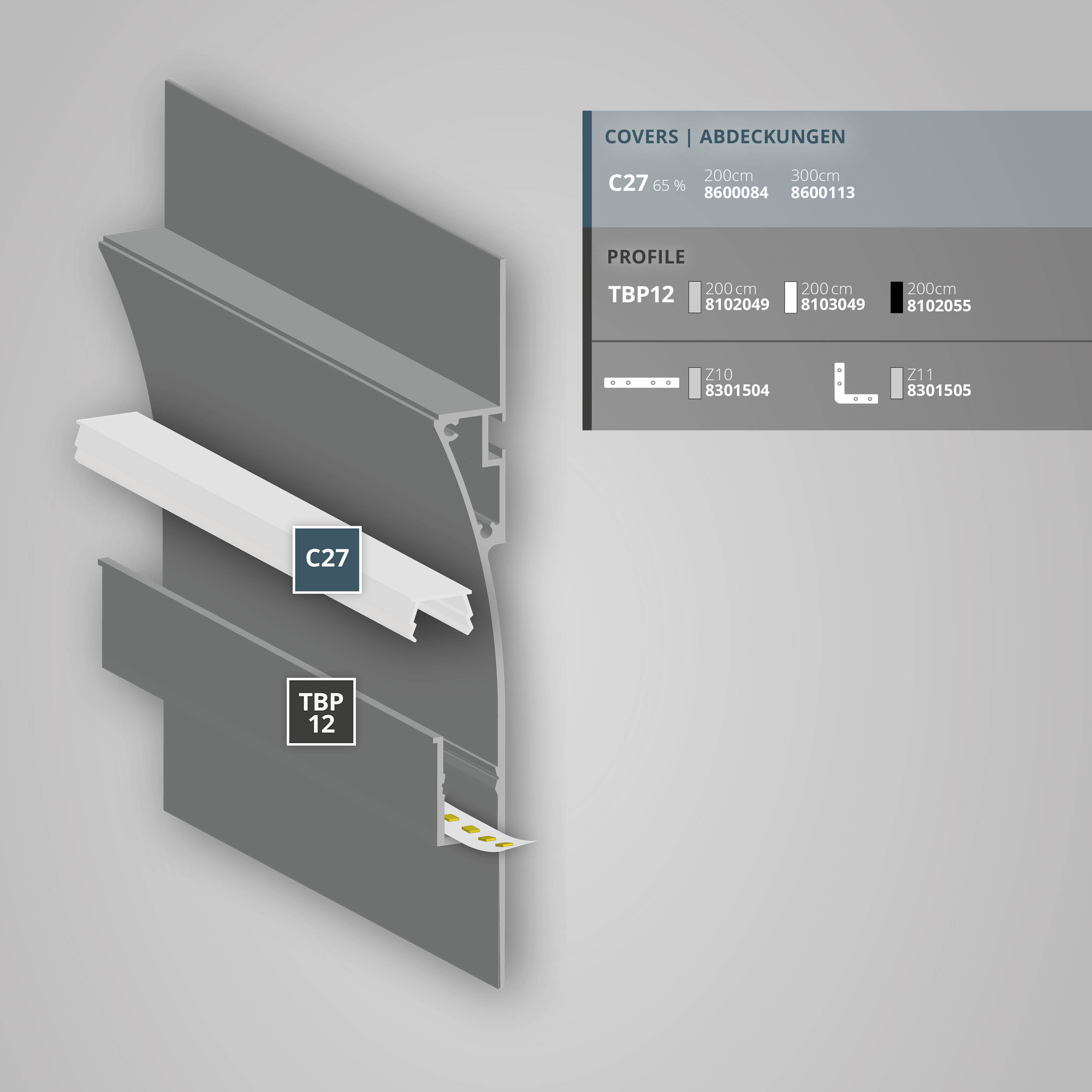 Zolltarifnummer: 76042990 Herkunftsland: CN|zulässige Umgebungstemp.-20°C - 45°C | | Farbeweiß | | Länge [mm]2000,0 | | Höhe [mm]15,0 | | Breite [mm]143,0 | | Gewicht [g/Stk]1690 | | Einbautiefe in mm15 | | Max. Breite Stripe11 | | Innenhöhe in mm8 | | erforderliche Kühlmasse g/m845 | Das TBP12 LED Trockenbau-Profilsystem ist ein vollwertiges Leuchtenmodul, das für LED-Strips mit einer maximalen Breite von 11 mm geeignet ist. Die seitlichen Flügel werden mit den Gipsplatten verbunden und verklebt oder verspachtelt. Die Profilabdeckung besteht aus bruchsicherem, schwer brennbarem Polycarbonat. Das System ermöglicht nachhaltige, indirekte LED-Beleuchtung. Für optimale Haftung der LED-Stripes wird eine gründliche Reinigung der Profil-Innenseiten empfohlen.}