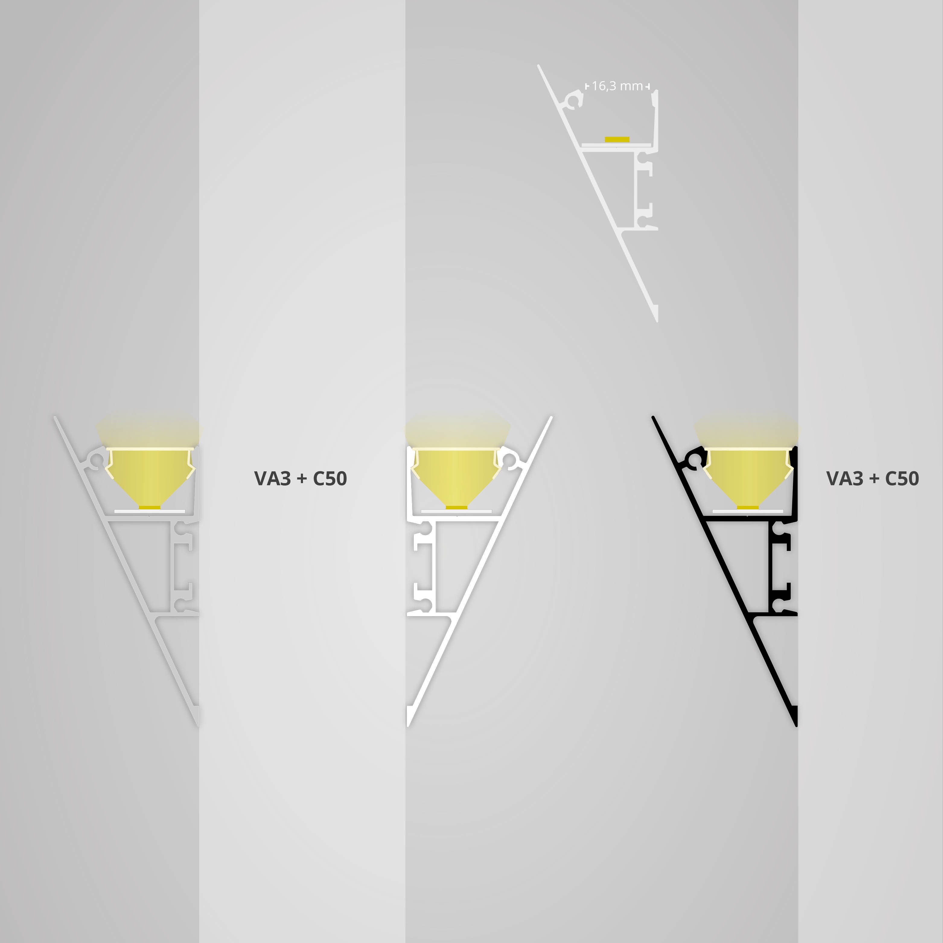 Zolltarifnummer: 76042990 Herkunftsland: CN|zulässige Umgebungstemp.0°C - 40°C | | Farbesilber eloxiert | | SchutzartIP20 | | Länge [mm]2000,0 | | Höhe [mm]58,0 | | Breite [mm]27,0 | | Max. Breite Stripe16 | | Innenhöhe in mm12.5 | | erforderliche Kühlmasse g/m402 | Das VA3 LED Profil für indirekte Beleuchtung besteht aus hochwertigem eloxiertem Aluminium und sorgt durch das rückversetzte Cover für eine indirekte, blendfreie Beleuchtung. Das dreieckige Design ist in Silber, Weiß und Schwarz erhältlich und eignet sich ideal für dekorative Anwendungen. Für optimale Haftung der LED-Streifen wird eine gründliche Reinigung der Profil-Innenseiten empfohlen.}