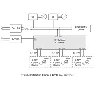 Der 0-10V to DALI Konverter wandelt ein 0-10V Analogsignal in einen DALI Dimmwert um. Das Modul stellt eine DALI Versorgung für einen DALI Kreis mit bis zu 10 Lasten zur Verfügung (30mA). Das Gerät verfügt über einen aktiven und passiven 0-10V Eingang. Die Konfiguration der Dimmcharakteristik ist über Jumper möglich. Eine zusätzliche Konfiguration über die Software DALI Cockpit ist nicht vorgesehen.