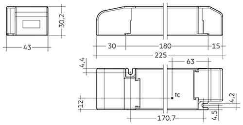 dimmbarer LED Konstantspannungskonverter60W / 24Vdimmbar per: DALI, DSI, switchDIM (Taster), corridorFUNCTION, ready2mainsDimmbereich 1 - 100%, Kunststoffgehäuse mit Zugentlastung geeignet für Einbau und unabhängige MontageNotlichtnorm nach EN5017250.000h Lebensdauer / 5 Jahre GarantieAbm.: 225 x 43 x 30 mm